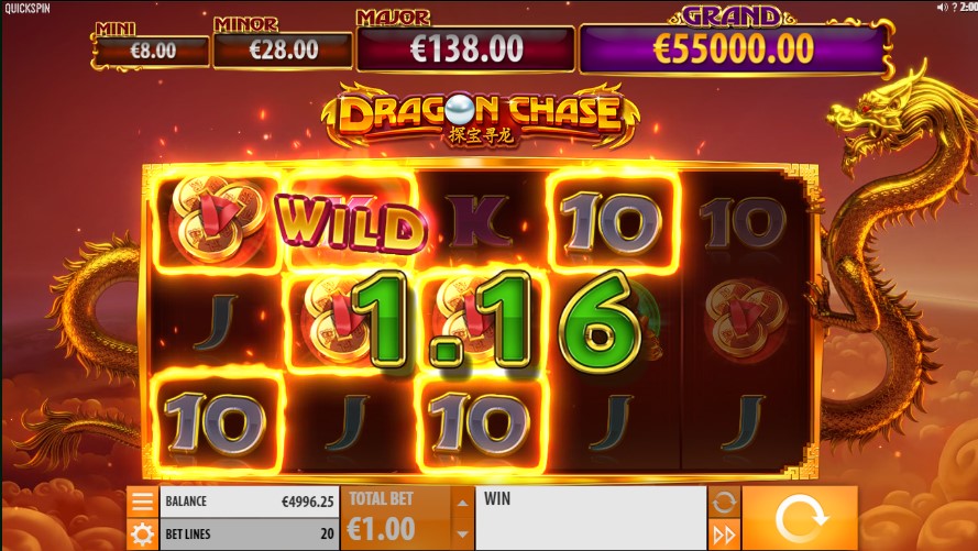 Dragon Chase er en videoslot med fem hjul, tre rader og 20 faste lønnslinjer. Gevinster deles ut for bare tre til fem identiske symboler fra venstre mot høyre. Du kan jage drager og jackpoten på datamaskinen, mobiltelefonen og nettbrettet fra 0,20 til 100 studiepoeng per spinn. RTP for dette spillet med en gjennomsnittlig spredning er satt til 96,39%.